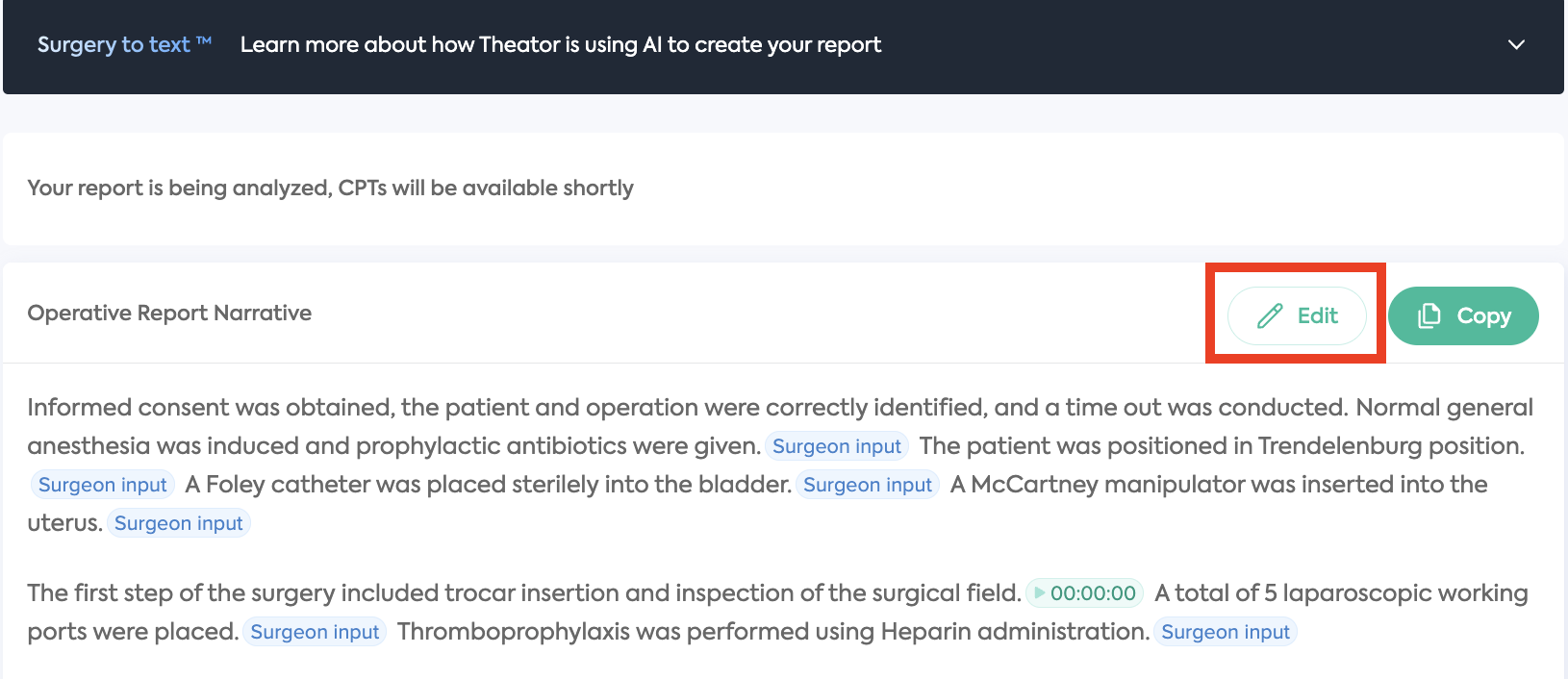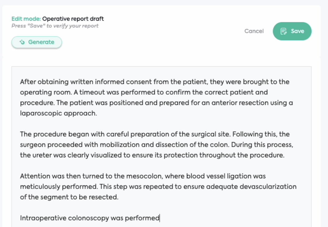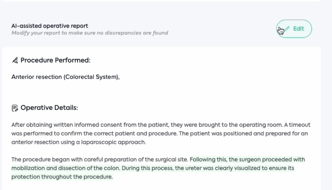 The Operative Report AI Assistant automates the creation of operative reports, helping surgeons streamline the documentation process. This feature captures relevant events from surgical videos and cross-references them with the footage to ensure accuracy before submission to the Electronic Health Record (EHR) system.